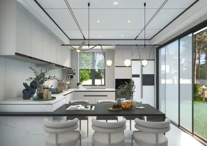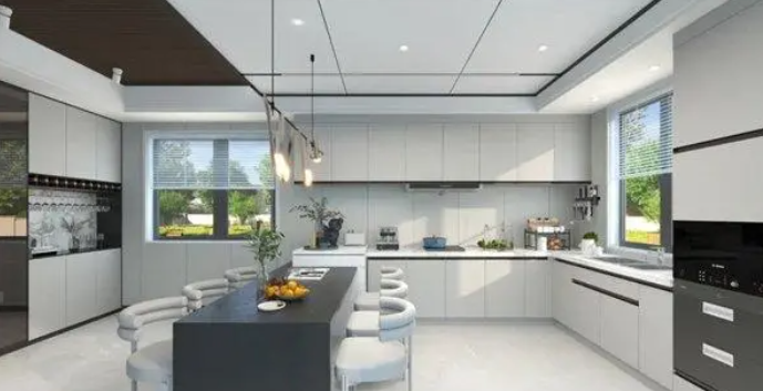 頂部以白色蜂窩大板吊頂,線(xiàn)型燈帶和筒燈相結(jié)合,打造簡(jiǎn)約時(shí)尚現(xiàn)代廚房。